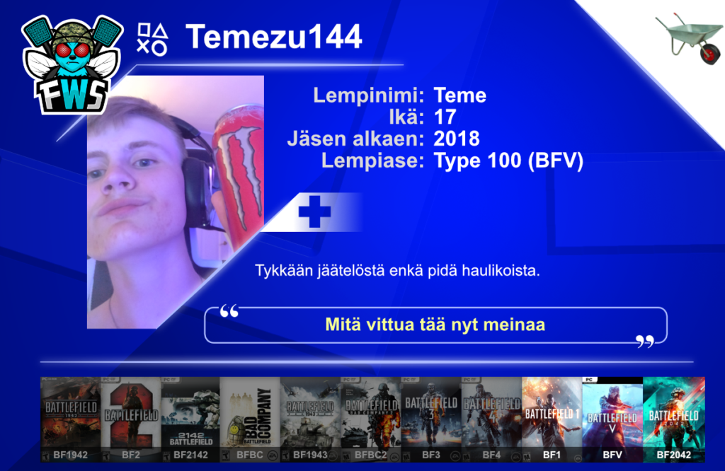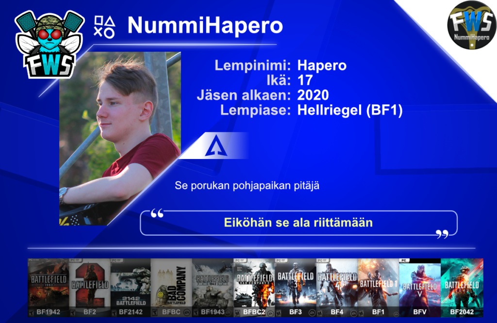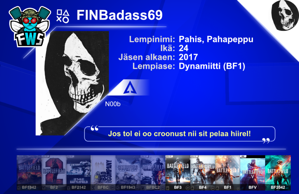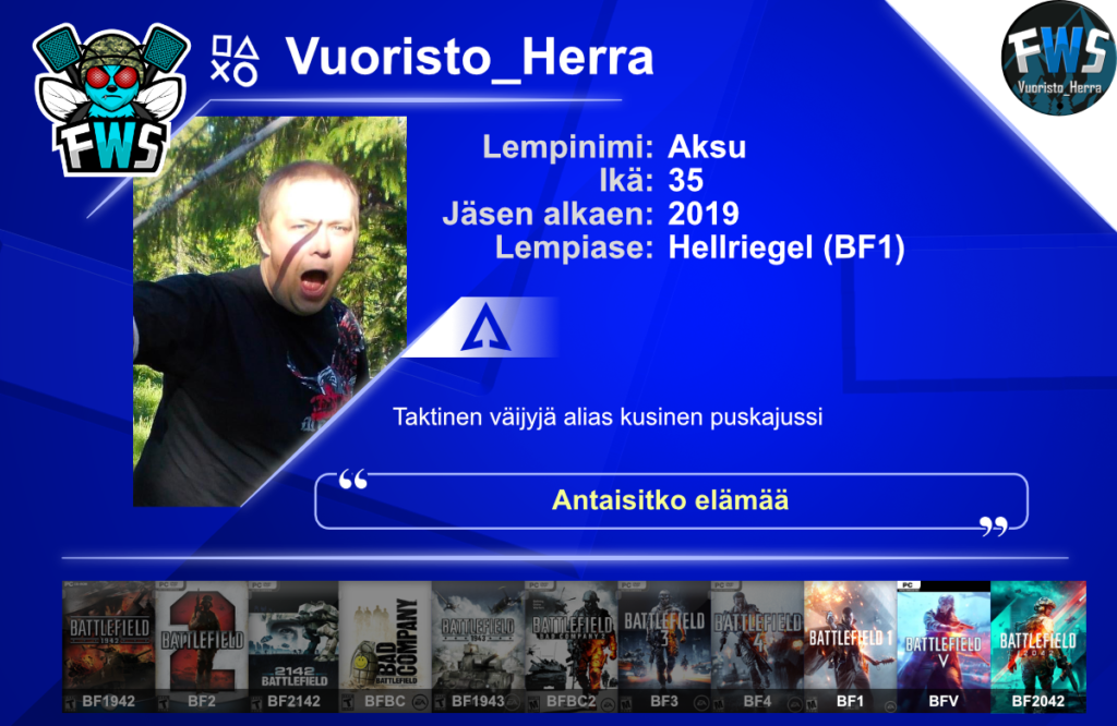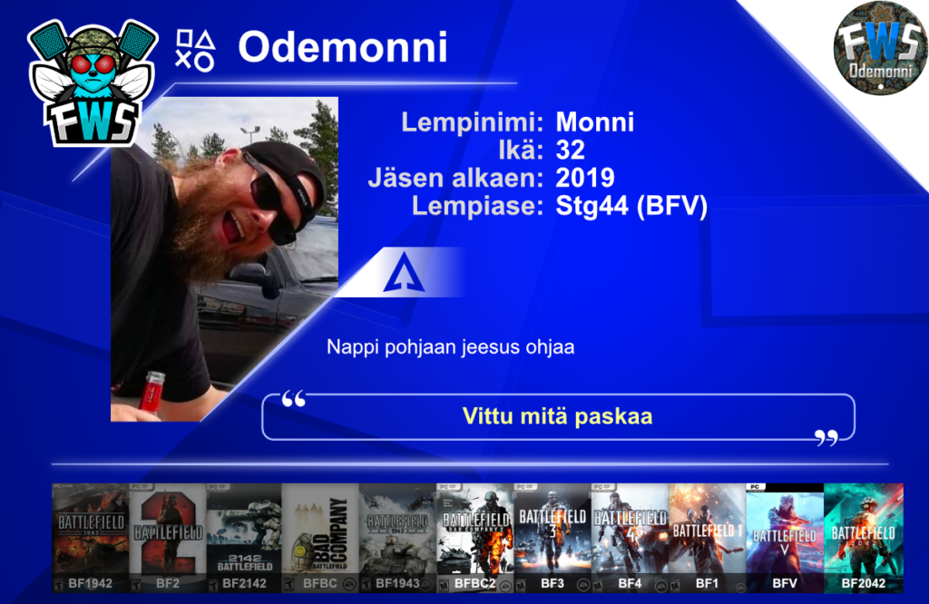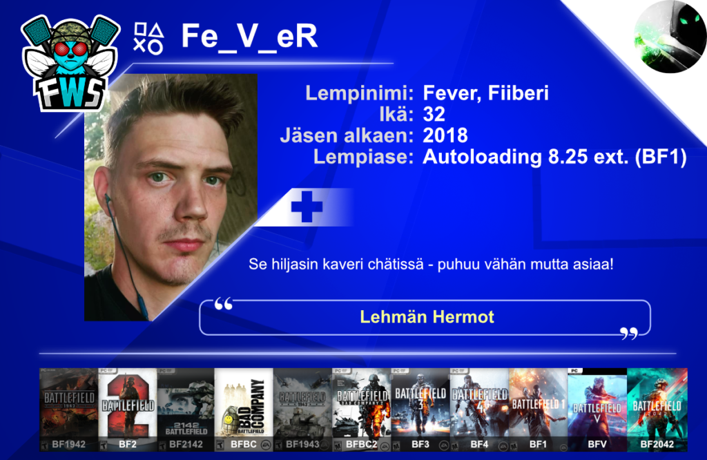 Mikäli mielit jäseneksi, niin pyydä kamuksi ja pelaa FWS jäsenten kanssa kanssa. Voit myös tulla jutustelemaan FWS Discordiin tai ottaa yhteyttä PSN kautta: