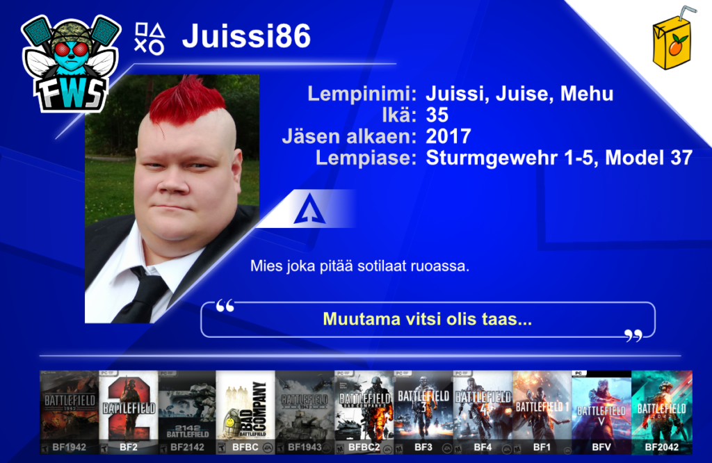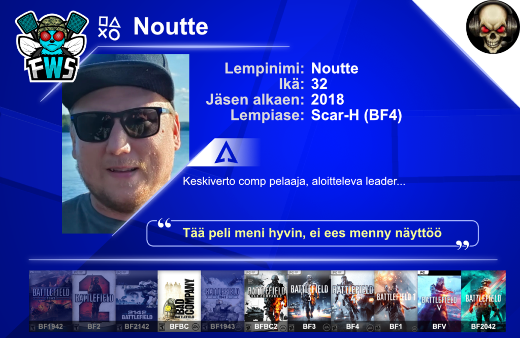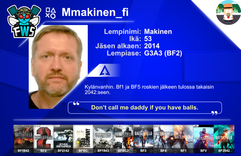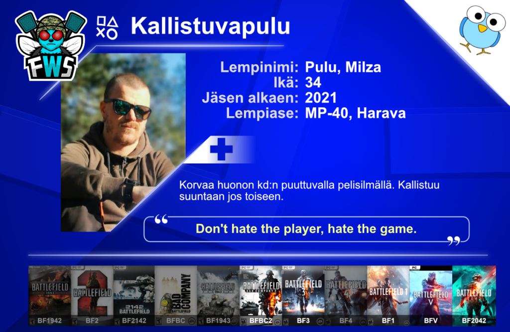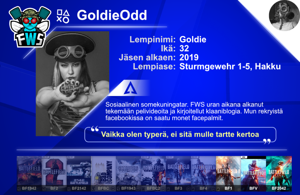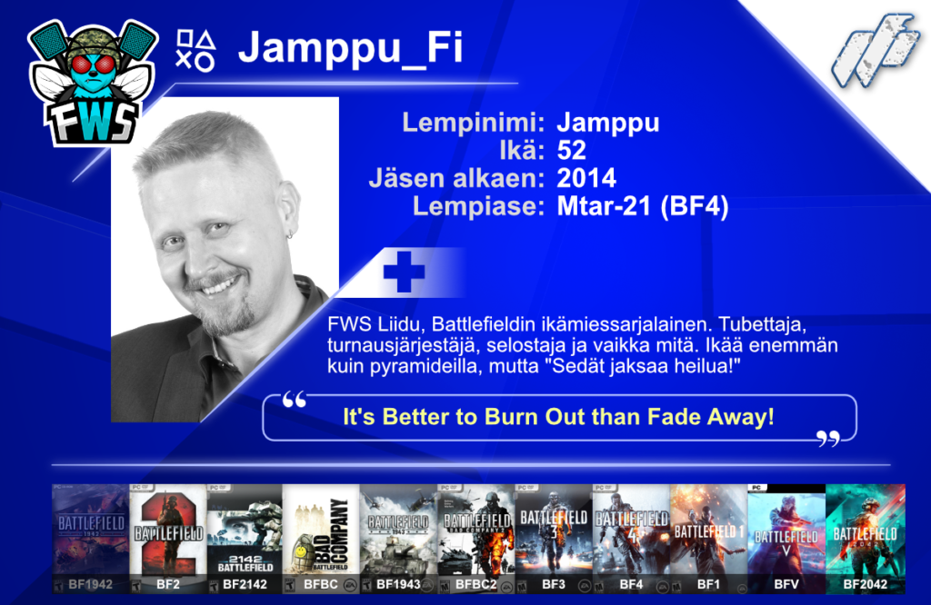 Mikäli mielit jäseneksi, niin pyydä kamuksi ja pelaa FWS jäsenten kanssa kanssa. Voit myös tulla jutustelemaan FWS Discordiin tai ottaa yhteyttä PSN kautta: