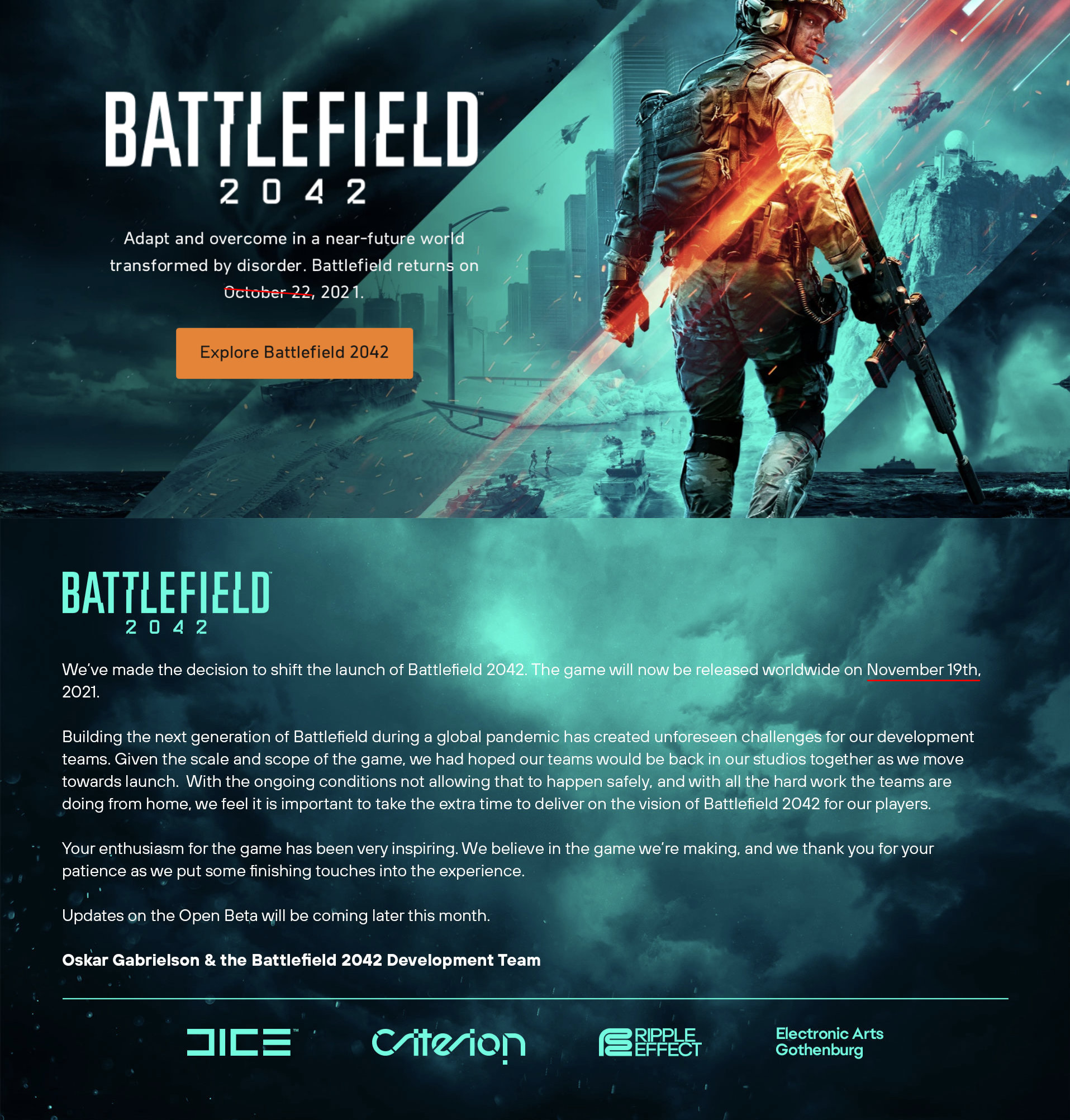 DICE ilmoitti tänään, että Battlefield 2042 pelin julkaisupäivää myöhästetään suunnitellusta 22.10.2021 miltei kuukaudella eteenpäin. Uusi julkaisupäivä on 19.11.2021.