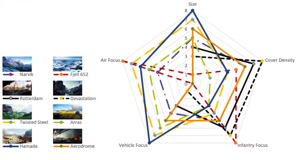 Battlefieldin kehittäjä DICE on ottanut karttasuunnittelun tosissaan ja luonut viisikohtaisen kategorisoinnin karttojensa kehitykseen. Kategorioiden avulla pyritään toteuttamaan karttoja, jotka kattaisivat kokonaisuutena mahdollisimman laajasti erilaisia pelikokemuksia.