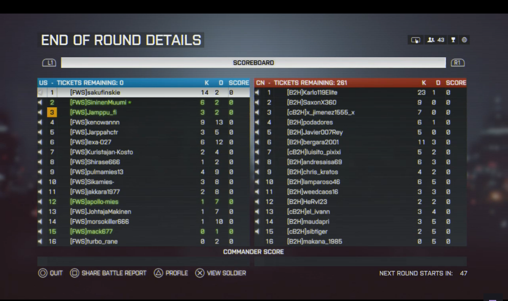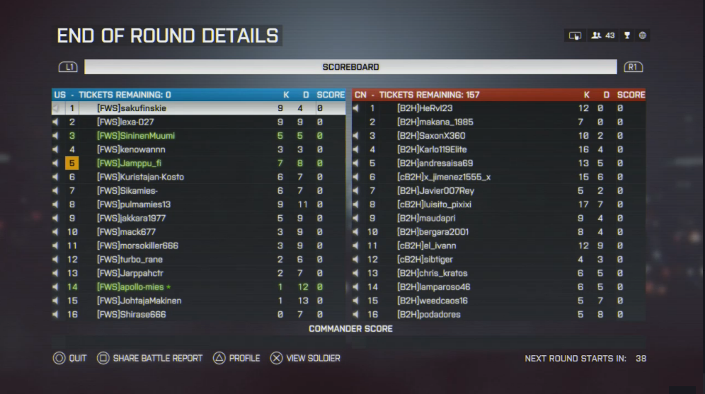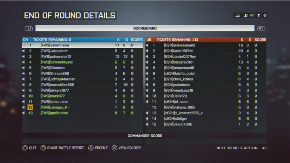 Tickettien valossa saatiin muutama ticketti enempi pois B2Hlta, mutta kyllä tulostaulu on karua katseltavaa. FWSn tiimissä ei montaa sotilasta ollut positiivisella KD ratiolla. B2Hn tulostaululla puolestaan komeili monta ukkona nollapelillä!